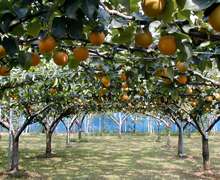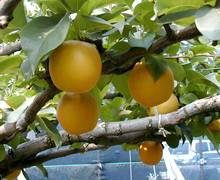 また、赤梨代表「長十郎」は、神奈川県川崎市の当麻辰次郎と言う人が、明治28年頃(1895年頃)発見した偶発実生の品種で、彼の家の屋号が長十郎だったため「長十郎」という名前になったようです。こちらは、病気に強く栽培しやすいこともあり、当時赤梨といえば「長十郎」と大変多く出回っていたようですが、その後、甘味がより多くおいしい梨を目指して品種改良が行われ、昭和34年ころ「菊水」と「君塚早生」の交配種「新水」、「菊水」と「早生幸造」の交配種「幸水」、「りの14」と「八雲」の交配種「豊水」という梨の御三家(梨三水)が誕生しました。 新しく、幸せで、豊かな、みずみずしい梨と言う意味でこの名前が与えられたそうですが、「幸水」、「豊水」は全国に名を馳せ、とても有名なおいしい梨の代表になってしまいました。もともと、これらの品種は「日本なし」の仲間で、「ニホンヤマナシ」という野生種を基本に改良されたものだと言われています。梨は、“なし”という名前が“無し”につながるのを嫌って、“ありのみ(有りの実)”とも呼ばれます。 さて、新鮮な梨を新鮮なまま味わうには、まず鮮度の良い梨を選ぶこと。色が濃く大ぶりで実が硬いもの。二十世紀などは実に袋をかけることが多いので、袋を取ってから日光に十分当たった黄色味が強い物がおすすめです。また、実が木についていた部分に緑が残っている方が新鮮な証拠です。保管は冷蔵庫で密封できるビニール袋で1週間が目安です。 でも、鮮度においては果樹園での「梨狩り」にかなうものはありません。お近くに梨狩りができるところありませんか?。時期的に「二十世紀」は終わりごろ、これからは関西方面は岡山あたりの「愛宕」や「晩三吉」、関東近郊では、高地にあたる長野、群馬あたりの「二十世紀」や「豊水」が狙い目です。少し涼しくなりかけた中秋の梨、甘味がのってとてもジューシー。まさに今世紀とともに歩んだ味を味わってみてはいかがでしょうか。 |