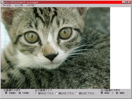 画素の数値が上がるにしたがって、表示できる画面との倍率が格段に上がってゆくことがわかります。 デジタルカメラは、あくまでも映像を記録することを目的です。このため、銀塩写真と同等なプリントを作成することができるように高画素化が進んでいます。画素数が大きくなれば記録される画像面積も広くなってゆくことになります。反対に、決められた面積の中(写真プリントのLサイズなど)に大きな画像を入れてしまうということは、画素の密度が高くなり、細かなところまで表現できることになります。 さて、皆さんがメールにデジタルカメラで撮影した画像を添付するときにどうしていますか? どのようにして画像を小さくしたら良いかわからないため、そのまま添付している方もおられるのではないでしょうか。 Windowsを搭載したパソコンには標準で画像の大きさを手軽に変更できるソフトがついていません。最新のペイントブラシはデジタルカメラのJPEG画像が使えるようになりましたが、画像サイズを%で指定しなければならず案外面倒です。 今回ご紹介するのは「aiイメージダイエット」というフリーソフト(無料)で「ai-square/あい・すくえあ」さんから出ています。操作する部分がほとんど無く、「物足りない」とおっしゃる方も居られるかと思いますが、今回はいかに簡単に画像を小さくするかがテーマですから、ご勘弁くださいね。 ソフトはWindows95/98に対応していますが、Windows2000でも問題なく動作しました。 ソフトウェアライブラリー「ベクター」のhttp://www.vector.co.jp/soft/win95/art/se146962.htmlからダウンロードすると「aiid102.exe」というファイルが保管されます。このファイルをダブルクリックすると任意のフォルダーにプログラムが展開されます。展開されたフォルダーにある「imgdiet.exe」をダブルクリックするとプログラムが起動します。(ショートカットを作成しておくと次回から便利です。) あとは、ファイル(F)−開く でデジタルカメラの画像データを選択して画像を表示させ、ウインドー下部の縦480・縦300・縦200のどれかをクリックすると、出力画像の大きさが表示されますので、適当な大きさを決めて、ファイル(F)−保存する を選択すると、デフォルトではファイル名にminの文字列が追加され保存することができます。