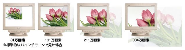 デジカメ質問集その4「デジカメ画像を小さくする」 デジタルカメラで撮影した写真をパソコンに転送して画像を表示したら、画面から飛び出してどこの部分が表示されているのかわからなかった経験はありませんか? 特に、100万画素以上のCCDを搭載したデジタルカメラは、その画素の多さから記録される画像サイズ(面積)が、とてつもなく大きなサイズになっているのです。 皆さんがご使用になっているパソコンによって画面に表示できる面積が異なっていますので、感じ方に差が出るものと思いますが、ノートパソコンの人気が高い国内では、最近やっとXGA(横1,024×縦768ピクセル)サイズの表示ができる機種が主流になってきました。それ以前の機種はSVGA(横800×縦600ピクセル)が最大でした。デスクトップ型でも17インチモニターでXGAサイズ、15インチモニターでSVGAサイズが標準的な使い方でしょうから、基本的に100万画素を超えるデジタルカメラで撮影した画像は、画像ソフトなどで縮小を行わないと画面からはみ出してしまうことになります。 それでは、デジタルカメラで撮影した画像はどのくらいの面積になるのでしょうか。 市場で人気の高いデジタルカメラの画像サイズを見てみましょう。