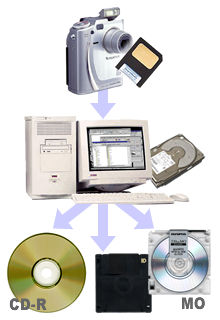 撮影した画像を残しておくには、パソコンとバックアップメディアが必須です。フィルムカメラはネガフィルムを残しておけばいつでも焼き増しが可能ですが、デジタルカメラの記録メディアは高価であり、撮影したままの画像データの保管には向きません。このため、パソコンの内蔵ディスクに画像データを残すか、CD-RやMOなどにコピーして保存する必要がありますが、パソコンの内蔵ディスクはシステムそのもののトラブルやハードウェアの故障などによるデータ消失が考えられ、あまりおすすめできません。このため、実用的な保存方法はCD-RやMOなどのメディアに保管することになります。300万画素を超えるデジタルカメラの画像データは、1枚で2メガバイト弱のデータとなり、CD-R1枚(約640MB)にフィルム約10本分(36枚換算)位の保管しかできません。また、元の画像データがないと焼増し時に紙焼きプリントからのコピーになってしまい、画質的にはかなりデメリットが生じます。