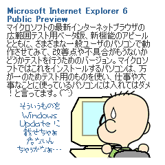 Internet Explorer 6 Public Preview」をインストールしてみました。ところがどっこいすんなり動作してくれません。会社のパソコンの環境では、いろいろと障害が発生し、今まで見ることができたページが見られなくなってしまいました。