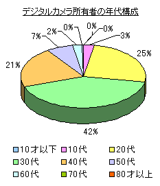 次に、デジタルカメラの所有状況ですが、図3のとおり35%の方が所有されております。年代別では図4のようになっており、アンケート回答者の年代構成(※図2)と同様な傾向にあることから、デジタルカメラがある特定な年代に支持されているという傾向は見受けられません。また、ご所有のデジタルカメラの画素数は、図5のとおり、100万画素以下がもっとも多く33%、100〜200万画素が32%、200〜300万画素が19%と、デジタルカメラの普及に伴い、しだいに画素数の多いものに移行している状況が見受けられます。また、おもちゃデジカメといわれる1万円以下の製品も市場で伸びていることから、100万画素以下を押し上げる状況になっていると思われます。