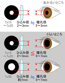 双眼鏡の「ひとみ径」が人間の「瞳孔」より大きければ何の問題もありません。ところが、夕方や夜間など、人間の瞳孔が大きくなっているときはどうでしょう。