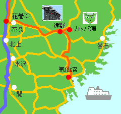 「遠野駅に河童がいる」とガイドブックにあったので、駅のロータリーを回って探してみたが見つからなかった。後でWebで調べたら、駅前広場の車が入れないところにある池の周りにたむろしていた。記念写真撮り損ねてしまった。