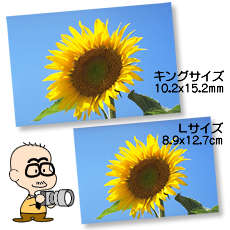 このところ、僕はキングサイズのプリントにはまっています。キングサイズははがきサイズとも言われ、官製はがきとほぼ同じ大きさになります。いつものLサイズと比べると、横幅が2.5cm、高さが1.3cmも大きくなるのです。やっぱり同じサービスプリントでもこれだけ大きくなると迫力があり、かえってLサイズの写真が小さいように感じてしまいます。面積比で約1.4倍弱大きくなるわけですから、その違いは一度体験されることをおすすめします。